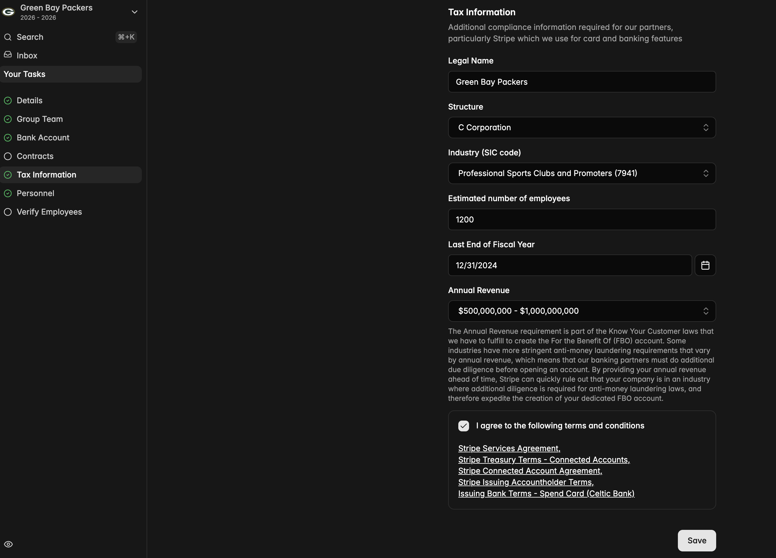 Please ensure the EIN entered in the personnel section is accurate and matches your legal business name exactly.Stripe verifies your legal name and EIN directly against IRS records. Mismatches will cause Stripe to flag or reject the account, which can delay onboarding.